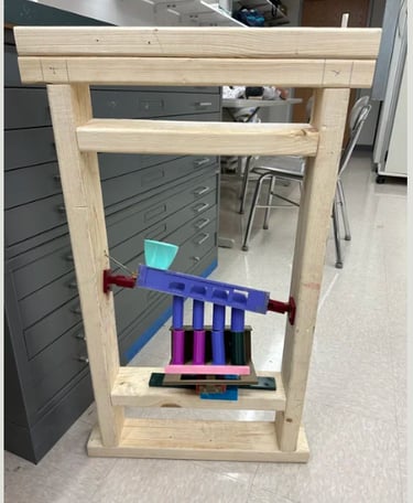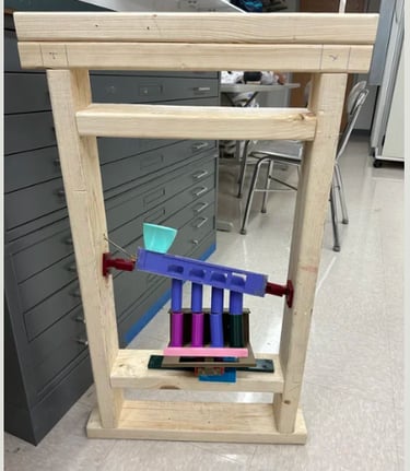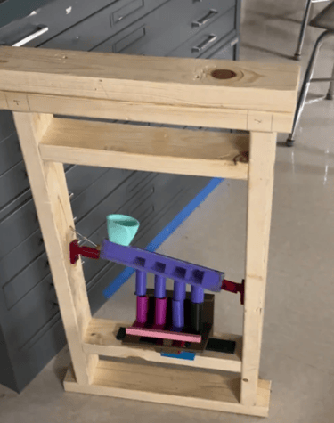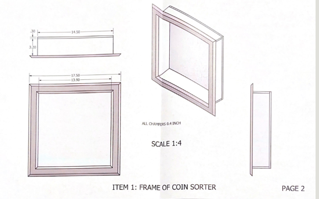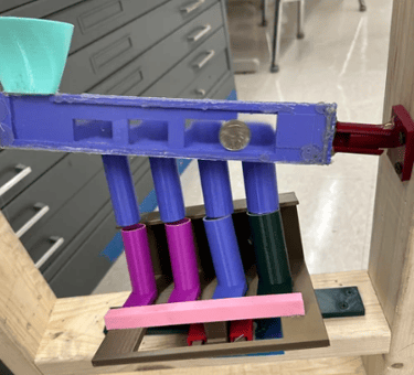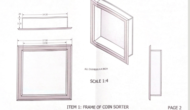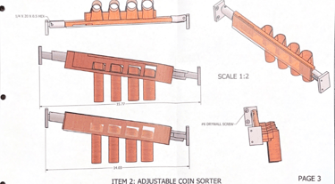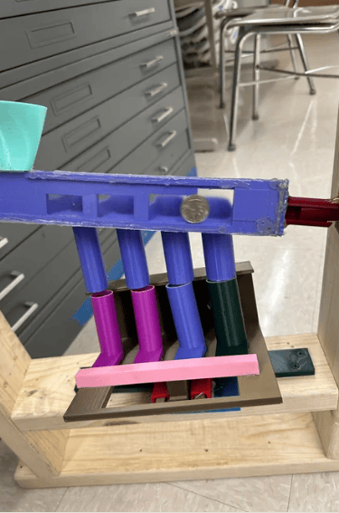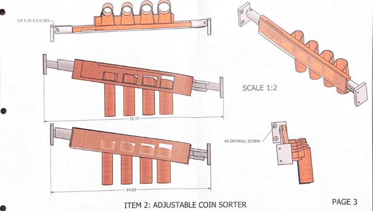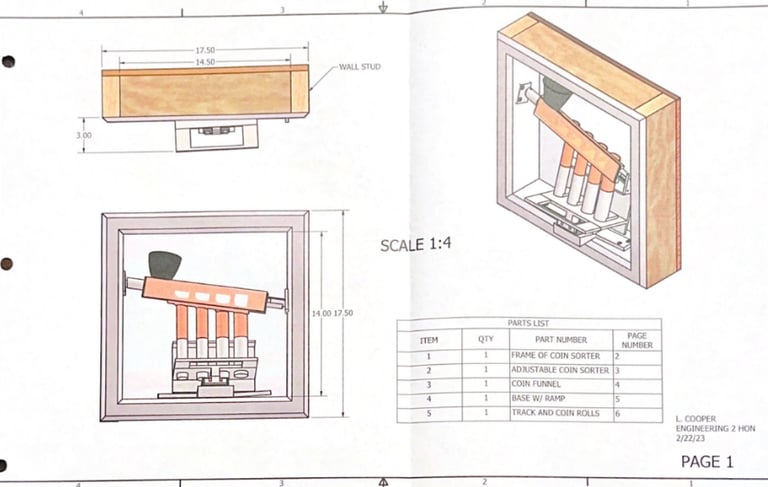 As one of our design projects, I designed and created a coin sorter. I also modeled it into wall studs so that it could be a practical home appliance that does not take up unnecessary space. The idea is that it takes quarters, dimes, nickels, and pennies through the funnel and they roll down the track. There is a plexiglass cover so that you can see the mechanism as it works. The coins then sort into the bottom part where the coin holders are measured to hold the perfect amount of coins to fit in a coin roll. For example, the quarter roll holds 40 quarters, the dime roll holds 50 dimes, etc.