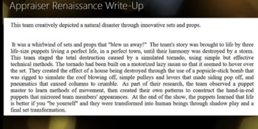 The DI Website: “In Destination Imagination (DI), students work together in teams to solve open-ended STEAM challenges designed to teach the creative process.”
