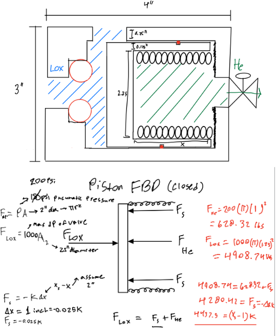 My first technical assignment was designing and machining a liquid oxygen (LOX) sleeve valve for use inside the rocket. I started with sketches and free-body diagrams to verify that the combined spring and helium chamber forces would exceed the external LOX forces. I learned a lot through this process about valves, design, and the importance of FBDs. These analyses guided several CAD iterations where I refined geometry, added chamfers for flow improvements, and accounted for machinability.
